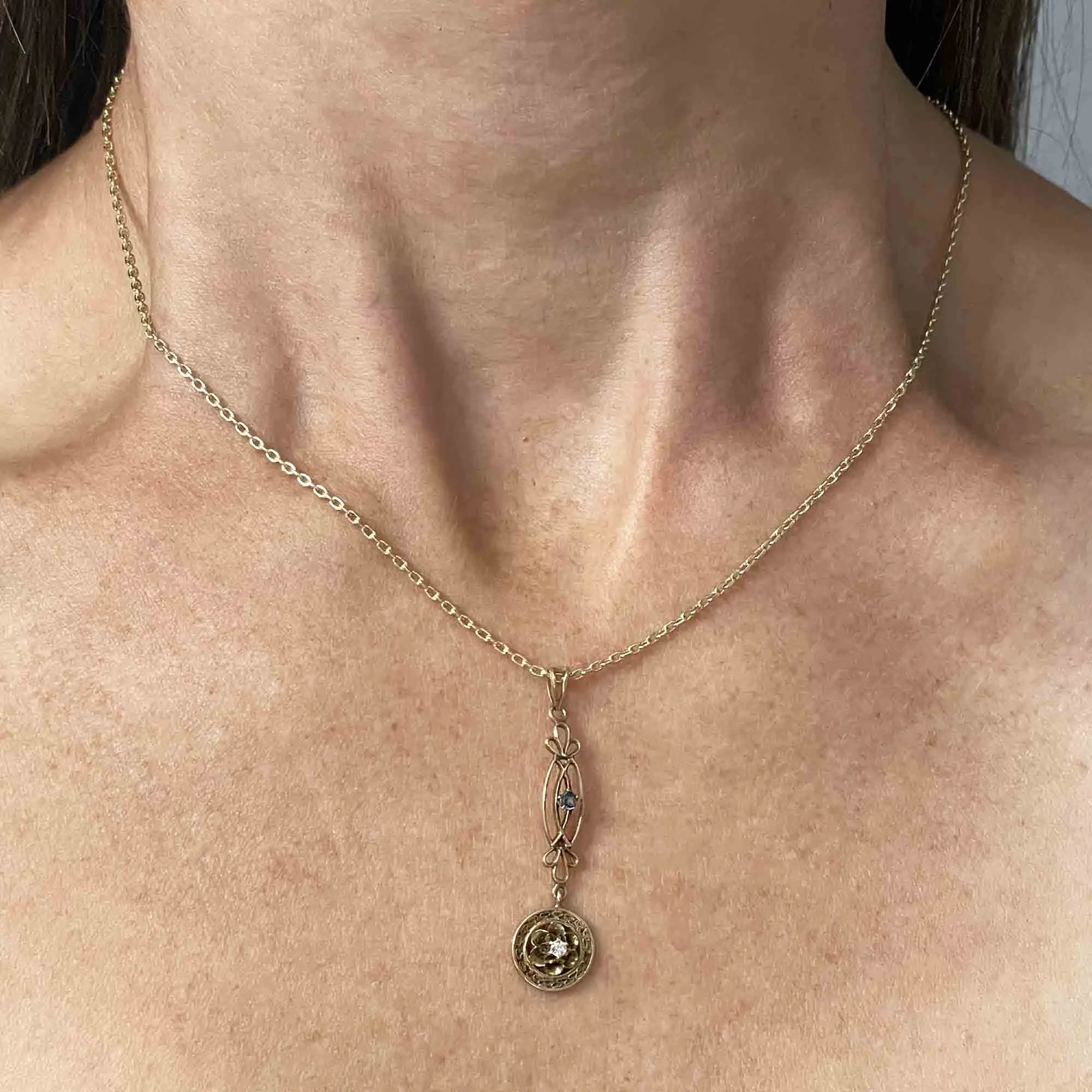 This delightful antique Art Nouveau necklace features a central diamond, surrounded by a beautiful gold filigree design and accented with a sparkling blue sapphire. The elegant carved gold bar adds a touch of sophistication to this classic piece of jewelry!